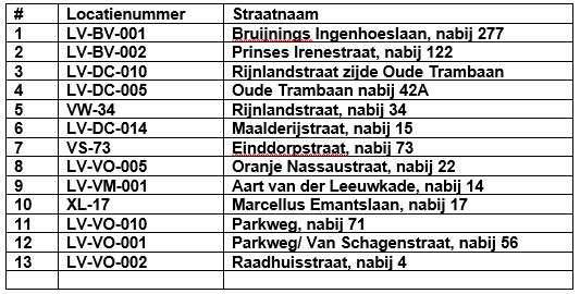 Tot 31 december 2021 was het mogelijk een zienswijze in te dienen. Deze zijn behandelend en beantwoord. Locatie LV-VM-004 nabij Cremerstraat 43 is hierdoor komen te vervalen. De aangewezen locaties voor definitief aanwijsbesluit zijn: