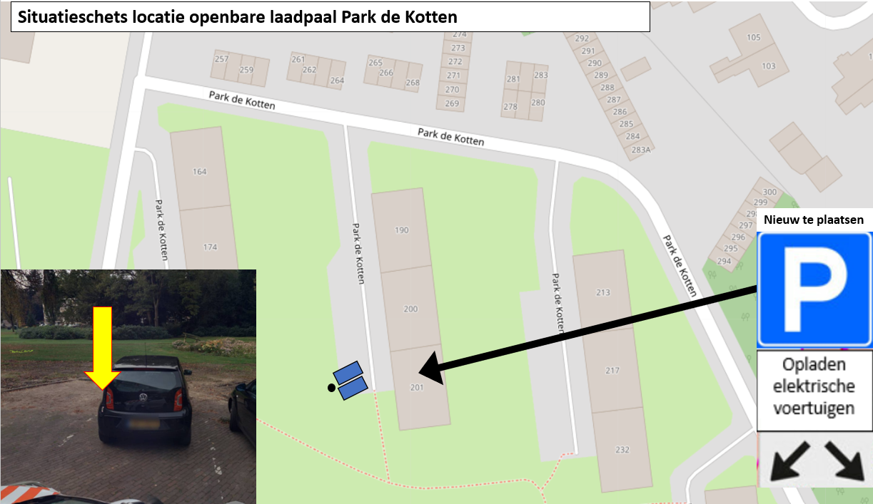 door middel van het plaatsen van het verkeersbord E4 van bijlage 1 van het RVV 1990 met een onderbord met de tekst ‘opladen elektrische voertuigen’ – en een onderbord met pijlen, waaruit blijkt dat het bord voor twee parkeerplaatsen van toepassing is – op Park de Kotten, een tweetal parkeerplaatsen te reserveren ten behoeve van het opladen van elektrische voertuigen.