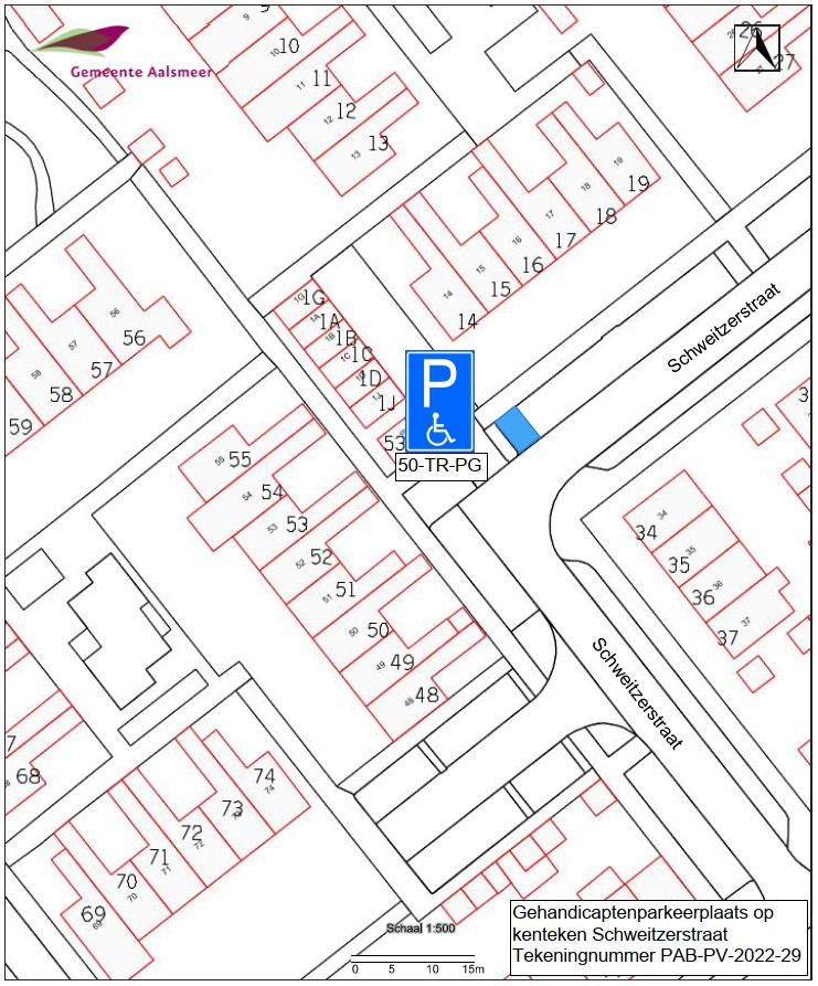 Burgemeester en wethouders van Aalsmeer besluiten het parkeren te verbieden op een parkeerplaats in de Schweitzerstraat, zoals aangegeven op tekening PAB-PV-2022-29, met uitzondering van het voertuig met het kenteken 50-TR-PG (gehandicaptenparkeerplaats).