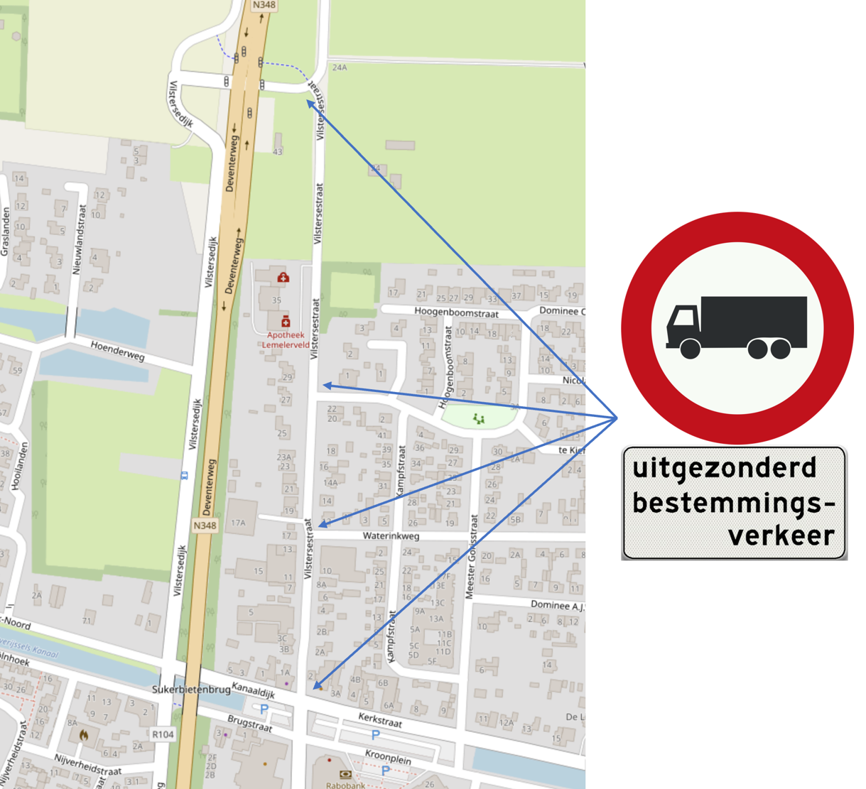 de geslotenverklaring voor vrachtverkeer kenbaar gemaakt wordt door middel van het plaatsen van verkeersbord C7 met onderbord ‘uitgezonderd bestemmingsverkeer’ op de locaties Vilstersestraat – Kerkstraat, Vilstersestraat – Waterinkweg, Vilstersestraat – Dominee C. Keersstraat en Vilstersestraat ter hoogte van het kruispunt met de N348;