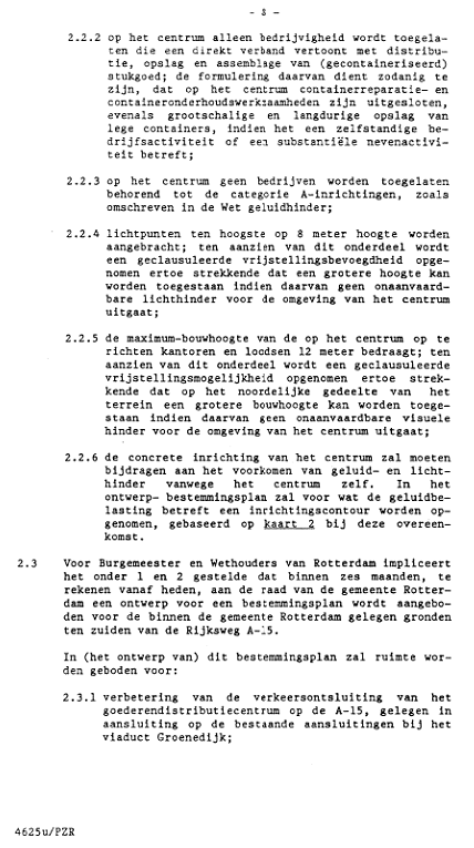 2.2.2 op het centrum alleen bedrijvigheid wordt toegelaten die een direct verband vertoont met distributie, opslag en assemblage van (gecontaineriseerd) stukgoed; de formulering daarvan dient zodanig te zijn dat op het centrum containerreparatie- en containeronderhoudswerkzaamheden zijn uitgesloten, evenals grootschalige en langdurige opslag van lege containers, indien het een zelfstandige bedrijfsactiviteit of een substantiële nevenactiviteit betreft;