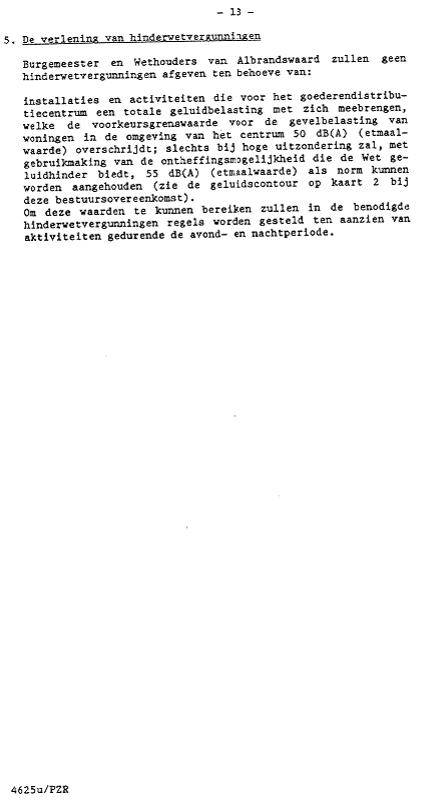 Installaties en activiteiten die voor het goederendistributiecentrum een totale geluidsbelasting met zich meebrengen welke de voorkeursgrenswaarde voor de gevelbelasting van woningen in de omgeving van het centrum 50 dB(A) etmaalwaarde overschrijdt; slechts bij hoge uitzondering zal, met gebruikmaking van de ontheffingsmogelijkheid die de Wet geluidhinder biedt, 55 dB(A) etmaalwaarde als norm kunnen worden aangehouden. Om deze waarden te kunnen bereiken zullen in de benodigde hinderwetvergunningen regels worden gesteld ten aanzien van activiteiten gedurende de avond- en nachtperiode.