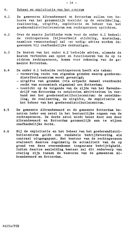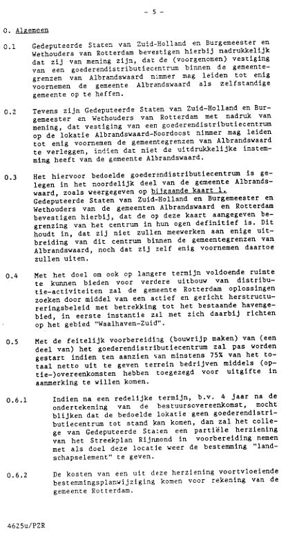 Bij de uitvoering van de bestuursovereenkomst kunnen vragen ontstaan. Dit betekent dat in die gevallen alle partijen zijn gehouden aan de noodzaak tot overleg waarbij oplossingen moeten worden nagestreefd die zo veel mogelijk passen in het karakter c.q. de strekking van de bestuursovereenkomst. Van belang is te melden dat in de bestuursovereenkomst is voorgeschreven dat de gemeente Rotterdam daar waar delen van het te realiseren bos en het distributiecentrum op het grondgebied van de gemeente Rotterdam liggen qua bestemmingen aansluiting moet zoeken bij dienovereenkomstige bestemmingen in het plan van de gemeente Albrandswaard.