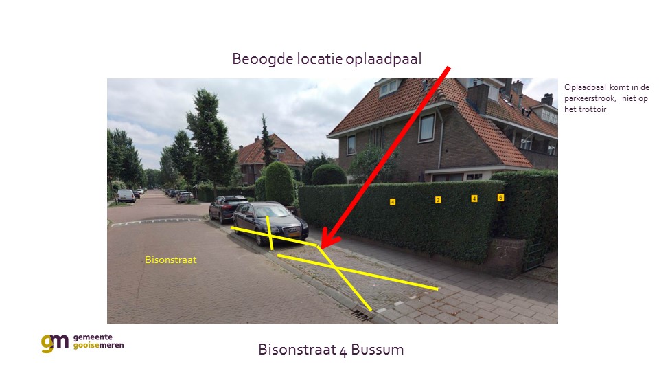 De gemeente Gooise Meren heeft naar aanleiding van een verzoek van een (toekomstige) e-rijder besloten om een oplaadpaal te laten plaatsen in de Bisonstraat te Bussum ter hoogte van de woning met huisnummer 4.