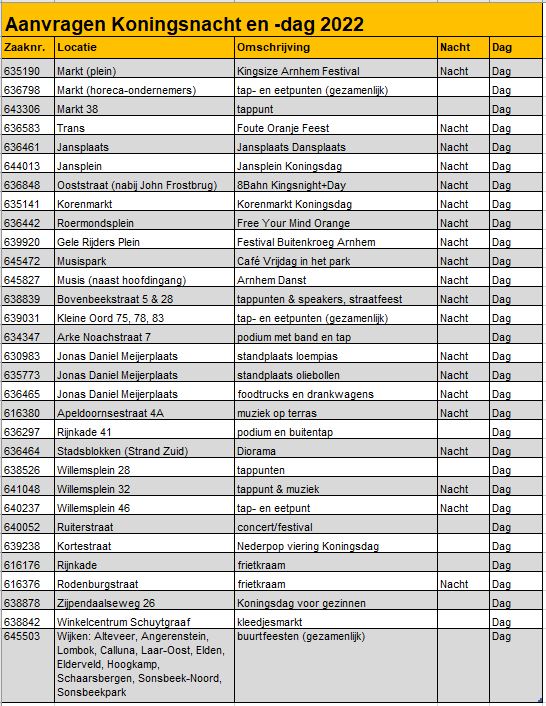 Gemeente Arnhem - Aangevraagde evenementenvergunningen Koningsnacht en -dag 2022