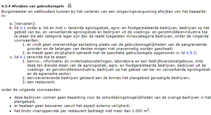 Omdat het provinciaal inpassingsplan niet concreet aangeeft binnen welke begrenzingen deze afwijkingsbevoegdheid toegepast kan worden, is het wenselijk om in aanvulling op het eerdere memo cumulatieve randvoorwaarden te stellen waarmee de toepassing van lid 4.5.4, sub c, onder 2 geconcretiseerd kan worden. De achtergrond en interpretatie van de afwijkingsbevoegdheid en het besluit van het Dagelijks Bestuur dat niet meer dan 10% van het plangebied gebruikt mag worden voor de vestiging van AGF-gerelateerde bedrijven (bedrijven die service verlenen aan agrologistieke of agrofoodgerelateerde bedrijven), vormen de basis voor de (aanvullende) cumulatieve voorwaarden.
