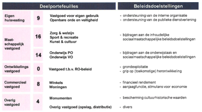 De huidige vastgoedportefeuille omvat thans 50 objecten, ten opzichte van 60 objecten in 2012. Met het afstoten van vastgoed wordt er gestreefd naar een vastgoedportefeuille met objecten die toegevoegde waarden hebben voor de gemeente.