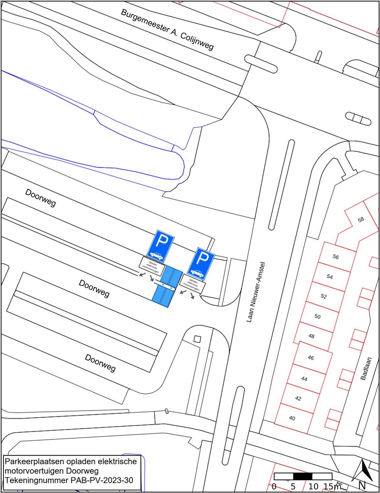 Burgemeester en wethouders van Amstelveen besluiten om op het parkeerterrein aan de Doorweg vier parkeerplaatsen aan te wijzen als parkeerplaats voor het opladen van elektrische motorvoertuigen. De parkeerplaatsen mogen alleen gebruikt worden voor het opladen van deze elektrische motorvoertuigen.
