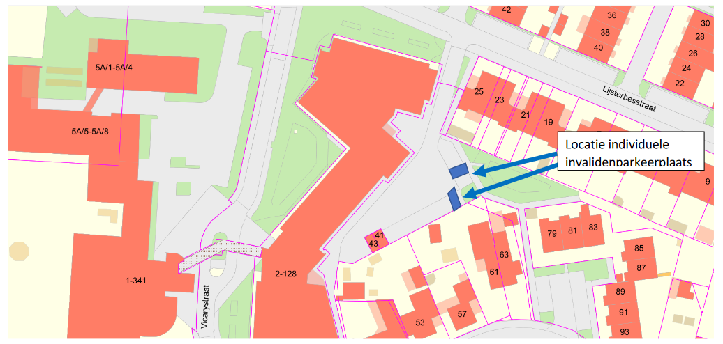 E.e.a. conform de situatieschets ‘Situatieschets Individuele invalidenparkeerplaatsen Vicarystraat’ welke ter verduidelijking als bijlage aan dit besluit is toegevoegd.