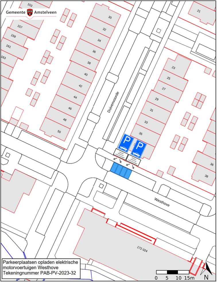 Burgemeester en wethouders van Amstelveen besluiten om in de straat Westhove vier parkeerplaatsen aan te wijzen als parkeerplaats voor het opladen van elektrische motorvoertuigen. De parkeerplaatsen mogen alleen gebruikt worden voor het opladen van deze elektrische motorvoertuigen.
