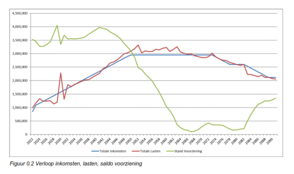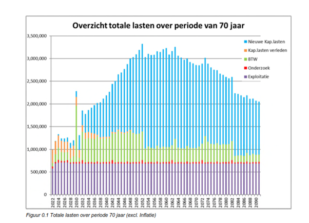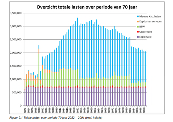 In figuur 5.1 zijn de lasten op langere termijn weergegeven. De totale lasten over de beschouwde periode van 70 jaar (2022 – 2091) bedragen circa EUR 172 miljoen