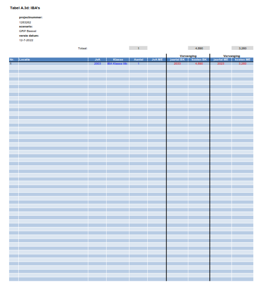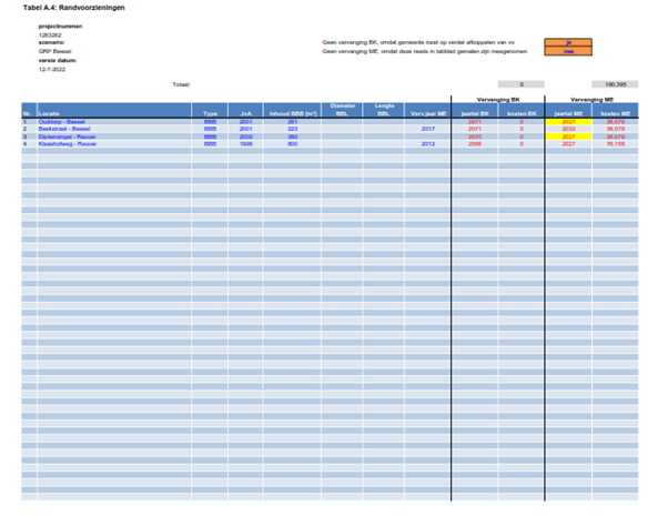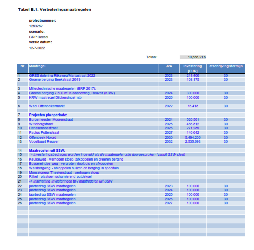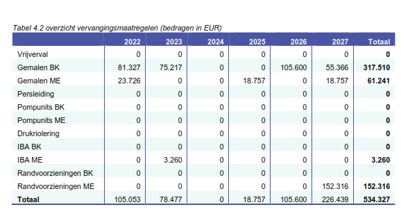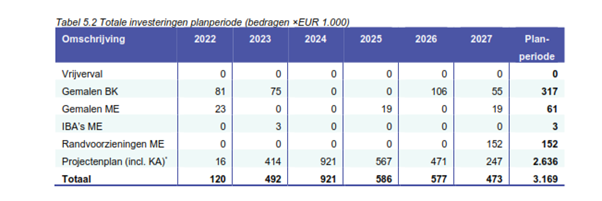 In tabel 5.3 is aangegeven welke investeringsbedragen in de planperiode nodig zijn voor vervanging en verbetermaatregelen, voor een overzicht van alle investeringen verwijzen wij naar bijlage 6. De maatregelen die in 2022 zijn uitgevoerd zijn als nieuwe investeringen meegenomen