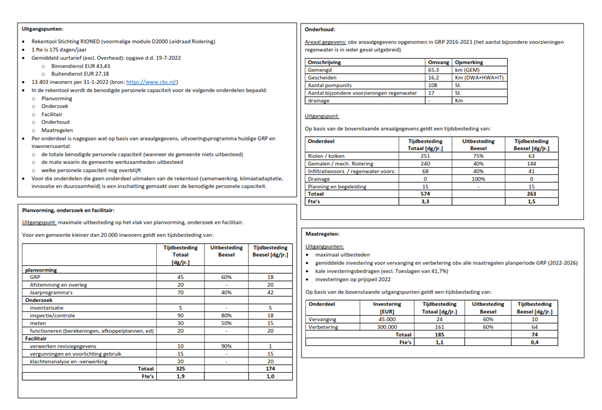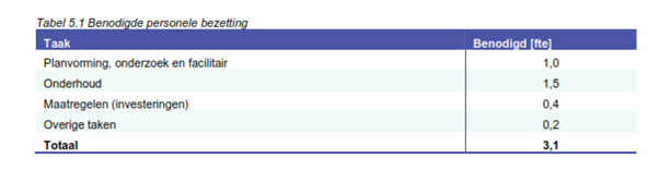 Om indicatief inzicht te krijgen in de benodigde personele middelen heeft stichting RIONED een rekentool ontwikkeld. Met behulp van deze rekentool is een analyse gemaakt voor de benodigde personele inzet voor de gemeente Beesel. Het is bekend dat de rekentool niet volledig dekkend is op het gebied van klimaat en andere zaken. Hiervoor is een correctie doorgevoerd. De benodigde capaciteit hebben wij vergeleken met de beschikbare personele inzet. In bijlage 5 is de volledige analyse opgenomen. Onderstaand is een samenvatting weergegeven.
