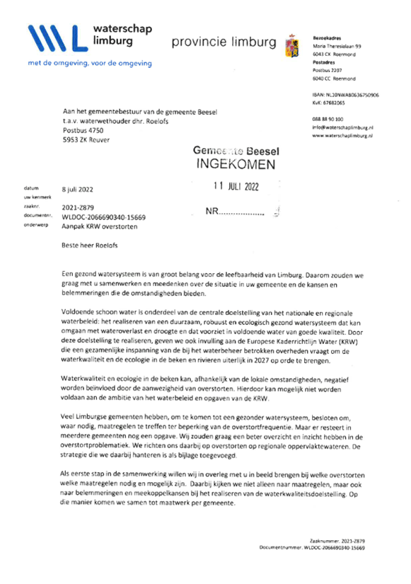 Inzicht krijgen in watersysteem Beesel: De komende planperiode gebruiken we om inzicht te krijgen in het (afval)watersysteem en helder in beeld te brengen waar samenwerking nodig is om ons doel te behalen. We willen een proactieve regierol nemen in water- en klimaatgerelateerde zaken op het grondgebied van de gemeente. Zo houden we overzicht over projecten waar andere overheden en/of maatschappelijke organisaties aan de slag gaan