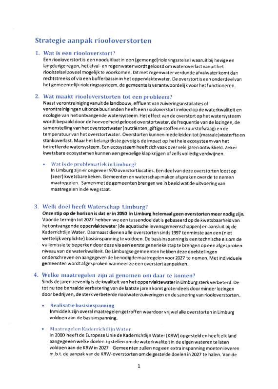 We dragen bij aan het signaleren van negatieve gevolgen van riooloverstorten op de kwaliteit van het oppervlaktewater. Binnenkomende meldingen met betrekking tot waterkwaliteit registreren en classificeren we en zetten we door naar het waterschap. Waar noodzakelijk onderzoeken we de oorzaak. Daarnaast maken we gebruik van de gegevens beschikbaar uit meten en monitoring en de periodieke berekeningen uit het SSW. We streven ernaar om, conform de stip op de horizon van waterschap Limburg, in 2050 helemaal geen overstorten meer te hebben (zie bijlage 4).
