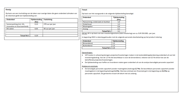 De kosten voor het in uitvoering brengen van investeringen maken onderdeel uit van de investeringsbedragen. Van de 1,5 fte die beschikbaar is voor de binnendienst, rekenen we 0,5 fte direct toe aan de betreffende projecten/investeringen. Op het taakveld riolering belasten wij 1,0 fte binnendienst 9 en 1,3 fte buitendienst door, dit is in totaal 2,8 fte. Deze personele middelen ervaren wij als voldoende om de werkzaamheden binnen het taakveld uit te voeren. Als in de toekomst meer vraag komt naar inzet binnen samenwerkingsverbanden en werkzaamheden op het gebied van klimaatadaptatie is mogelijk aanvulling van de personele middelen nodig.