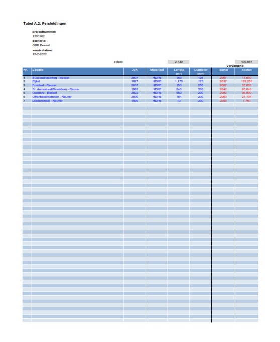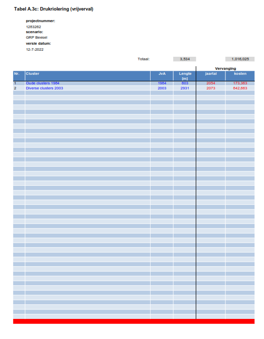 De vervangingsplanning voor de lange termijn is opgesteld op basis van aanlegjaar + technische levensduur. Hierbij houden we een technische levensduur van 70 jaar aan.