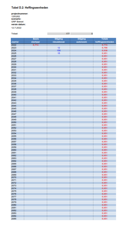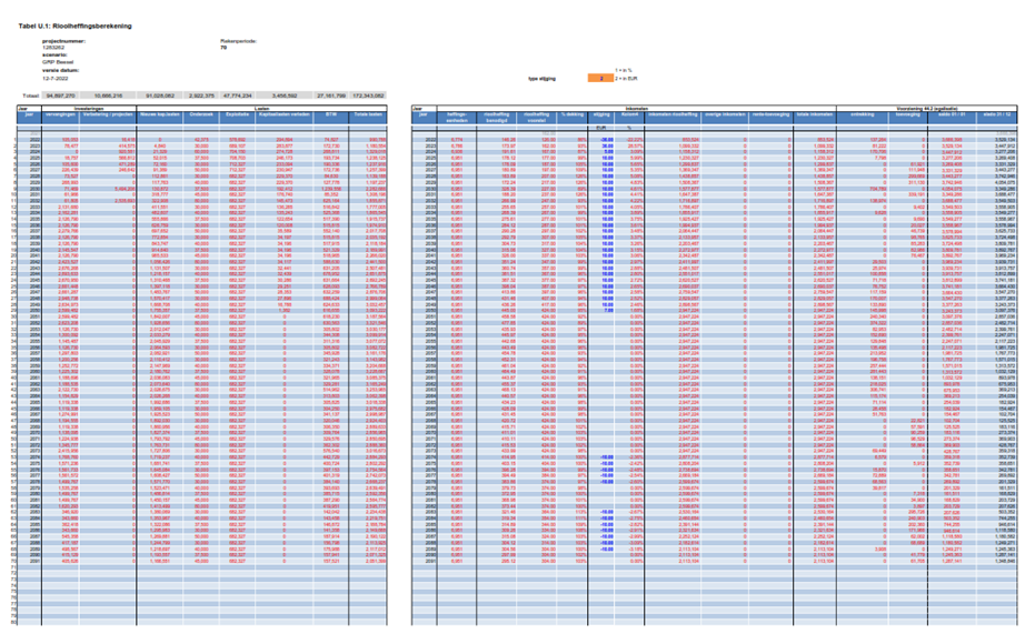 In bijlage 7 zijn de resultaten van de heffingsberekening opgenomen. In figuur 0.2 is het verloop van inkomsten, lasten, saldo voorziening over een periode van 70 jaar weergegeven. In figuur 0.3 staat het verloop van de rioolheffing over deze periode.