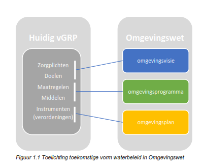 Door verdere vereenvoudiging van het omgevingsrecht vervangt de Omgevingswet (naar verwachting per 1 januari 2023) het voor wat betreft stedelijk water en riolering de Wet milieubeheer en de Waterwet. Deze wetwijziging heeft als direct gevolg dat de planverplichting voor het GRP komt te vervallen. Daarnaast worden drie nieuwe instrumenten geïntroduceerd, zie figuur 1.1. De gemeente Beesel kiest ervoor om elke 5 jaar een beleidsstuk zoals het GRP op te stellen, vanwege de directe relatie tussen gemeentelijke watertaken en de rioolheffing (financiën en personele inzet).