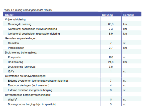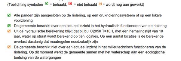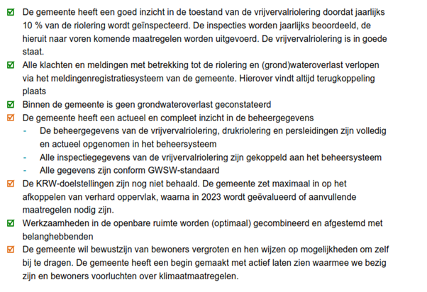 De huidige stand van zaken van onze rioleringszorg is vergeleken met de kwaliteit die we in de toekomst voor ogen hebben. Onderstaand is dit per onderwerp weergegeven. Tevens is een overzicht van het totale areaal opgenomen.