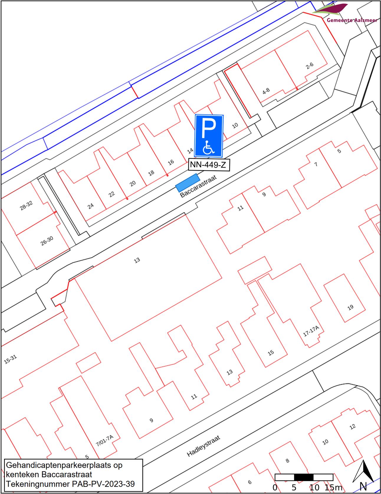 Burgemeester en wethouders van Aalsmeer besluiten het parkeren te verbieden op een nog te markeren parkeerplaats in de Baccarastraat, zoals aangegeven op tekening PAB-PV-2023-39, met uitzondering van het voertuig met het kenteken NN-449-Z (gehandicaptenparkeerplaats).