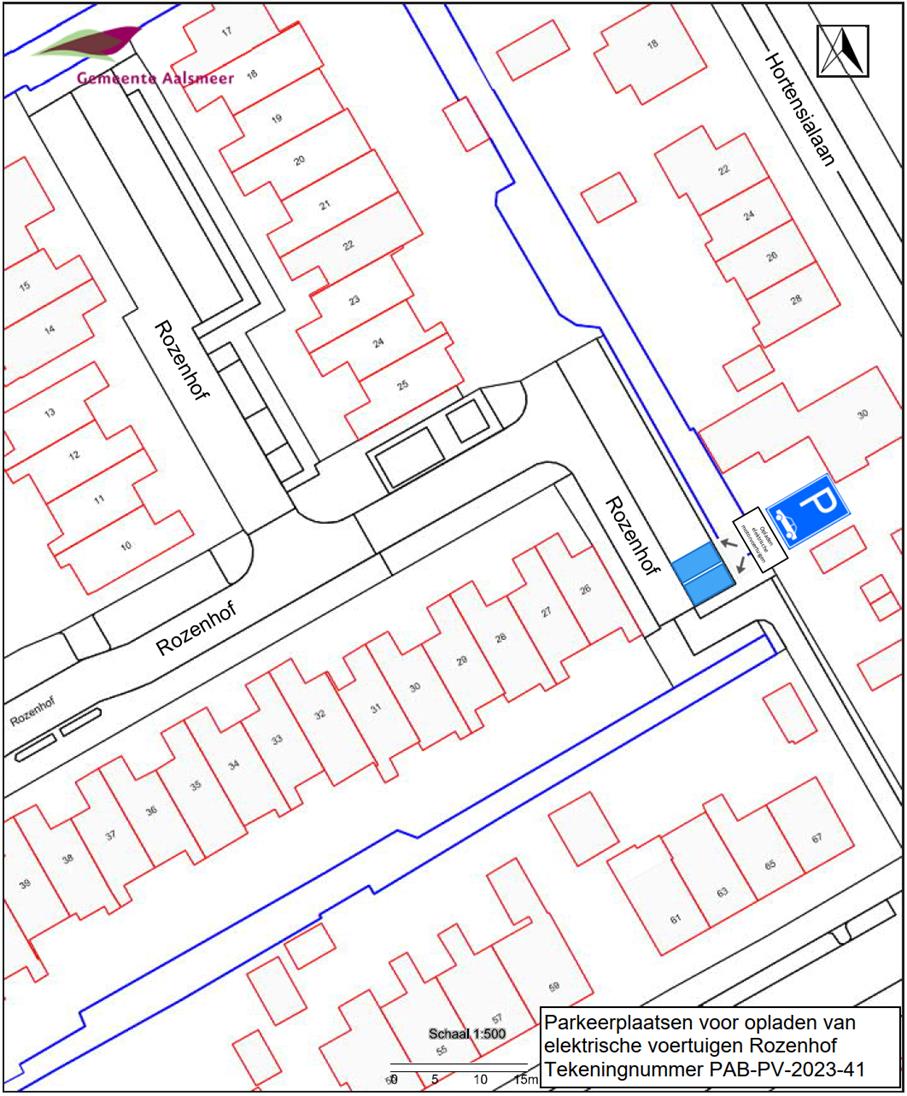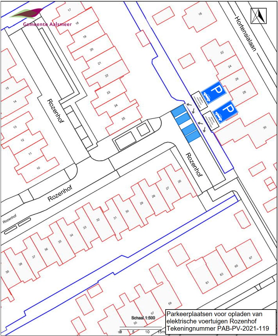 Burgemeester en wethouders van Aalsmeer besluiten tevens om in de straat Rozenhof twee parkeerplaatsen aan te wijzen als parkeerplaats voor het opladen van elektrische motorvoertuigen. De parkeerplaatsen mogen alleen gebruikt worden voor het opladen van elektrische motorvoertuigen. In Rozenhof zijn nu twee openbare laadpalen reeds geplaatst. Een van deze laadpalen wordt verplaatst en de andere wordt verwijderd. De parkeerplaatsen voor het opladen van elektrische motorvoertuigen waar de openbare laadpalen bij zijn geplaatst en waarvoor de aanwijzing reeds is ingetrokken, bij besluit van 19 september 2022 (zaaknummer Z22-073272), zijn weergegeven op de in dit besluit opgenomen tekening PAB-PV-2021-119.