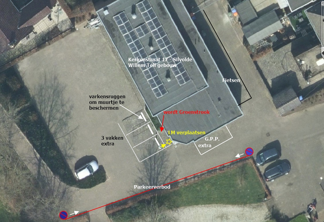 Het gebouw aan de Kerkenstraat 17 is in gebruik door Schuttersvereniging Willem Tell. In de huidige situatie is in deze omgeving regelmatig onvoldoende parkeercapaciteit voorhanden. Door de huidige fietsenstalling te verplaatsen kan het aantal parkeerplaatsen worden vergroot. Tevens is er behoefte aan een gehandicaptenparkeerplaats nabij de entree van het gebouw. Om de doorgang voor de hulpdiensten te waarborgen wordt op de Kerkenstraat, aan de overzijde van de te realiseren gehandicaptenparkeerplaats een éénzijdig parkeerverbod ingesteld.