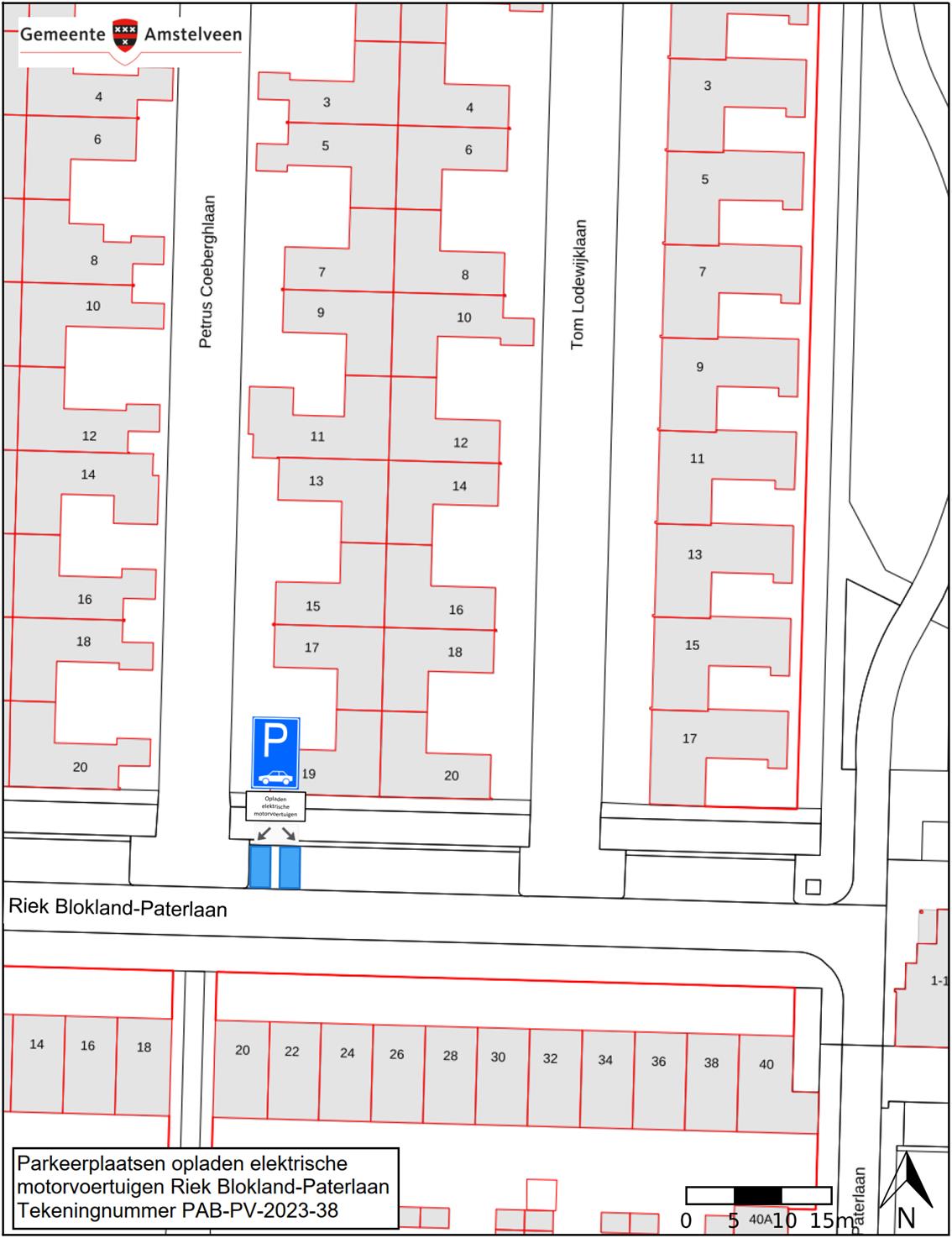 Burgemeester en wethouders van Amstelveen besluiten om in de Riek Blokland-Paterlaan twee parkeerplaatsen aan te wijzen als parkeerplaats voor het opladen van elektrische motorvoertuigen. De parkeerplaatsen mogen alleen gebruikt worden voor het opladen van deze elektrische motorvoertuigen.