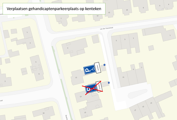 bovengenoemde gerealiseerd kan worden door het opheffen van de gehandicaptenparkeerplaats op kenteken ter hoogte van de van der Veenstraat 11 en het aanwijzen van een gehandicaptenparkeerplaats op kenteken ter hoogte van de Van der Veenstraat 5;