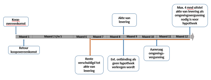 De koper is, vanaf zes maanden na het verstrekken van de optie tot het moment van juridische levering, over de koopsom een rentevergoeding ter hoogte van de wettelijke rente voor consumententransacties verschuldigd. Dit geldt ook wanneer de optietermijn met twee maanden wordt verlengd en wanneer de optienemer vóór het aflopen van de optietermijn al een koopovereenkomst heeft gesloten.