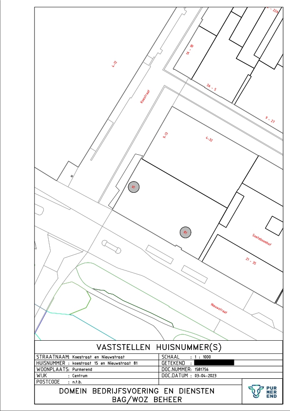 Kennisgeving huisnummerbesluit Koestraat 15 en Nieuwstraat 81 Purmerend