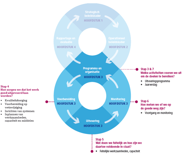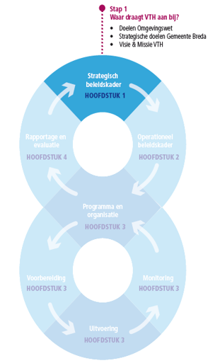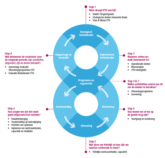 De Omgevingswet gaat uit van een goed samenspel beleid en uitvoering, waarbij VTH bijdraagt aan de strategische doelen van Gemeente Breda. Enerzijds door VTH uit te voeren volgens de regels die volgen uit de strategische keuzes, anderzijds door vanuit de uitvoeringspraktijk van VTH de strategische keuzes te evalueren en waar nodig aan te passen. Om dit goed vorm te geven, is dit beleidskader vormgegeven aan de hand van de BIG-8: een landelijk model dat de beleidsvormende cyclus (vierjaarlijks) verbinding met de uitvoerende cyclus (jaarlijks). Het geeft aan hoe de globale beleidsuitgangspunten vertaald worden naar de dagelijkse uitvoeringspraktijk en hoe resultaten in de uitvoering weer input zijn voor de strategie. Hiermee kunnen we de kwaliteit beter borgen en komen we tot een sluitende planning- en controlcyclus. Deze manier van werken op gebied van VTH is nieuw. Daarom zal in de komende jaren stap voor stap de uitvoeringspraktijk hierop ingericht worden.