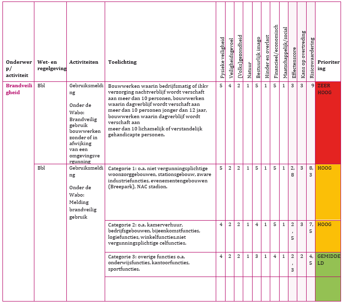 De risicoanalyse is de basis, met toekenning van prioriteiten, die bepalend zijn voor de mate waarin toezichtactiviteiten en de eventuele afhandeling worden uitgevoerd. De risicomatrix is opgesteld op basis van de beschikbare capaciteit. De uitgewerkte risicomatrixen staat in Deel II.