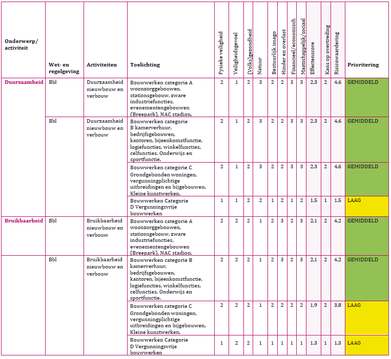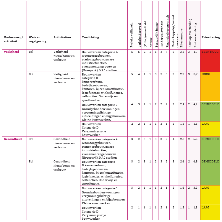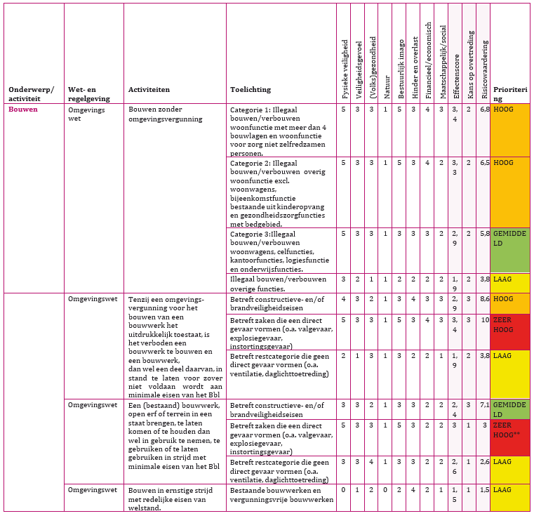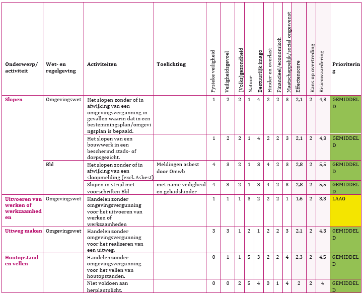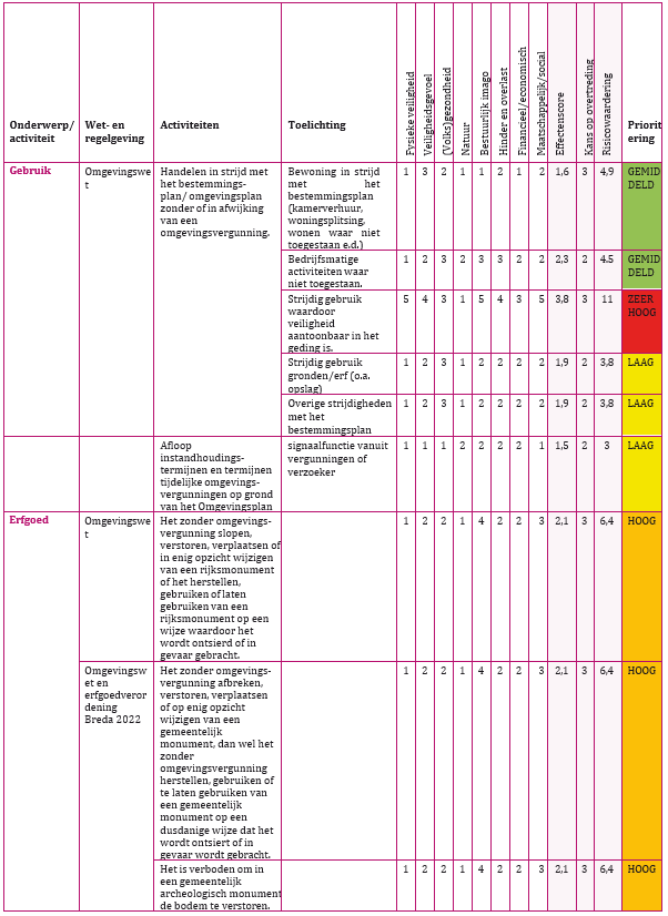 De risicomatrix bestaat uit een lijst met alle activiteiten van toezicht en handhaving met betrekking op de fysieke leefomgeving. Deze taken volgen grotendeels uit de Wabo, Woningwet, APV en Erfgoedverordening 2022.