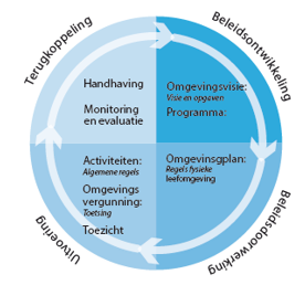 Deze terugkoppeling levert input voor eventuele wijzigingen/ aanpassingen die nodig zijn op strategische niveau. Zo leidt het cyclische proces tot nieuwe visievorming en daarmee mogelijk tot nieuwe maatregelen of regels in het omgevingsplan.