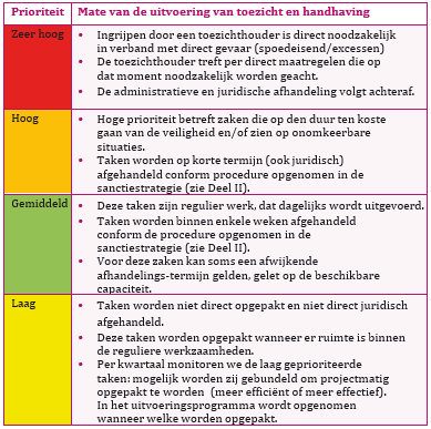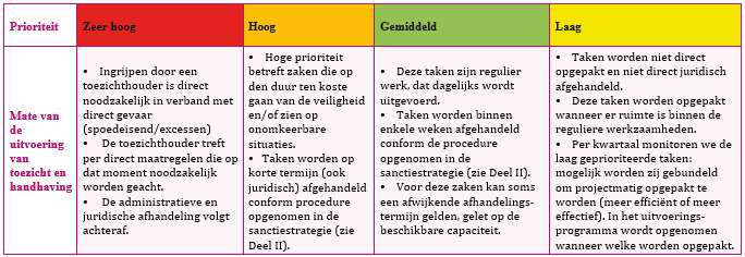 Een prioritering houdt niet in dat bepaalde handhavingstaken niet opgepakt worden. Op grond van de wet- en regelgeving zijn wij immers verplicht als lokale overheid toezicht te houden en in het geval van een overtreding handhavend op te treden. De prioritering geeft aan dat hoger geprioriteerde zaken eerder worden opgepakt dan lager geprioriteerde zaken. Bij een teveel aan hoger geprioriteerde zaken worden lager geprioriteerde zaken later opgepakt, eventueel in projectmatige vorm.