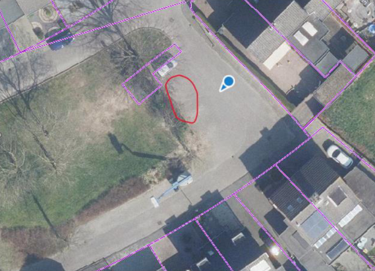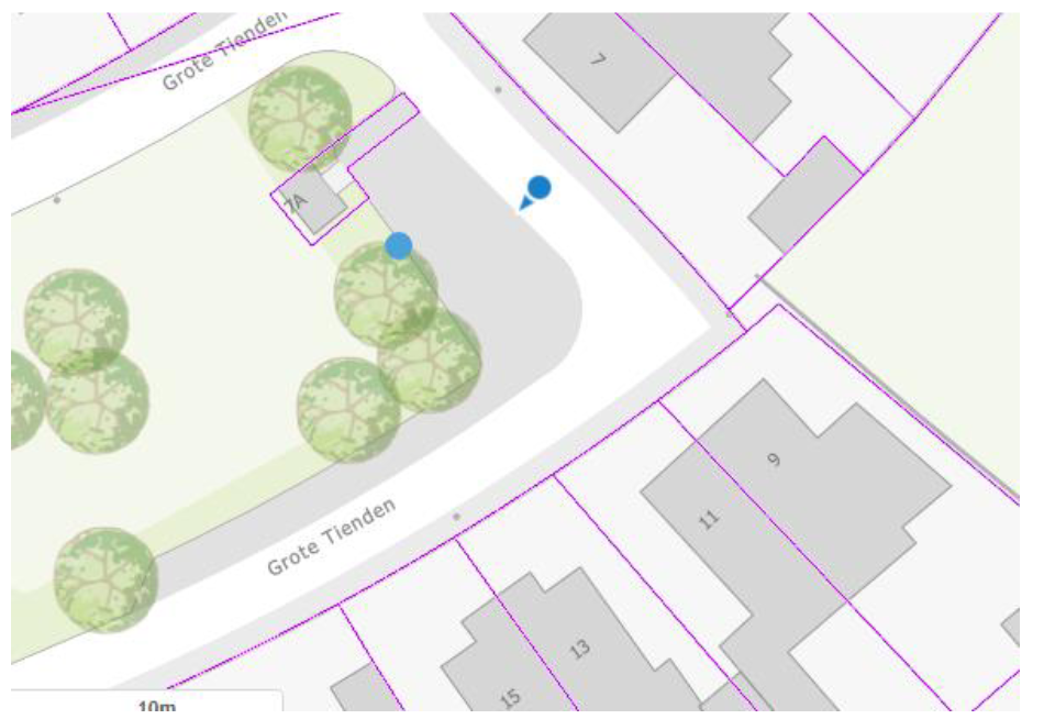 Aanbrengen van witte belijning ter aanduiding van de twee parkeervakken. Beide parkeervakken hebben een breedte van 2.5 meter. Dit op de parkeerplaats tegenover de Grote tienden huisnummer 7.