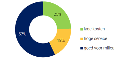 In de enquête zijn verschillende algemene vragen over afvalinzameling gesteld. Opvallend is dat het merendeel (57%) van de respondenten ‘goed voor het milieu’ het belangrijkste aspect vindt van afvalinzameling. ‘Lage kosten’ en ‘hoge service’ worden als minder belangrijk gezien (zie figuur 2.1).