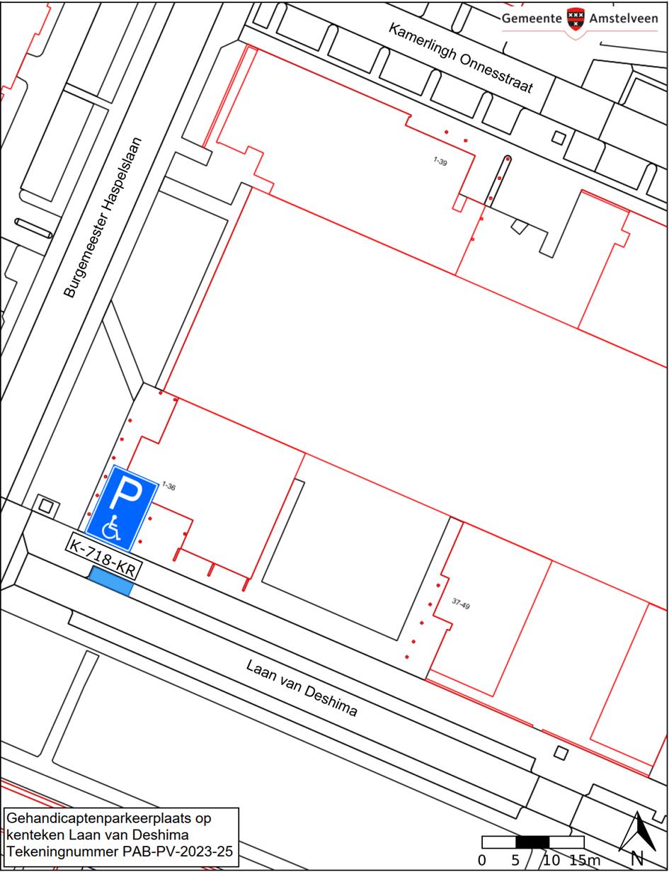 Burgemeester en wethouders van Amstelveen besluiten het parkeren te verbieden op een parkeerplaats in de Laan van Deshima, zoals aangegeven op tekening PAB-PV-2023-25, met uitzondering van het voertuig met het kenteken K-718-KR (gehandicaptenparkeerplaats).