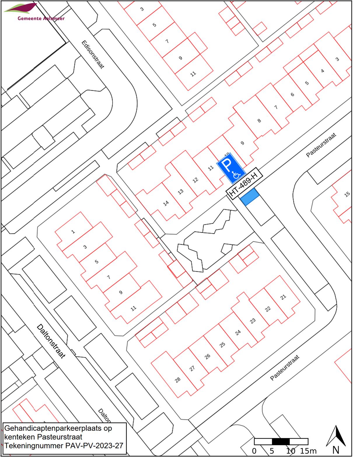 Burgemeester en wethouders van Aalsmeer besluiten het parkeren te verbieden op een parkeerplaats in de Pasteurstraat, zoals aangegeven op tekening PAB-PV-2023-27, met uitzondering van het voertuig met het kenteken HT-489-H (gehandicaptenparkeerplaats).