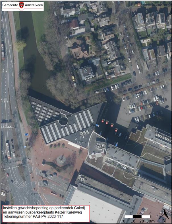 Burgemeester en wethouders van Amstelveen besluiten tot het instellen van een gewichtsbeperking op het parkeerdak van een ondergrondse parkeergarage, ten oosten van de ingang naar de garage, voor voertuigen zwaarder dan 2500 kg en het aanwijzen van de parkeerhaven aan de Keizer Karelweg, ter hoogte van het Cobra Museum, als parkeerplaats voor bussen, zoals aangegeven op tekening PAB-PV-2023-117.