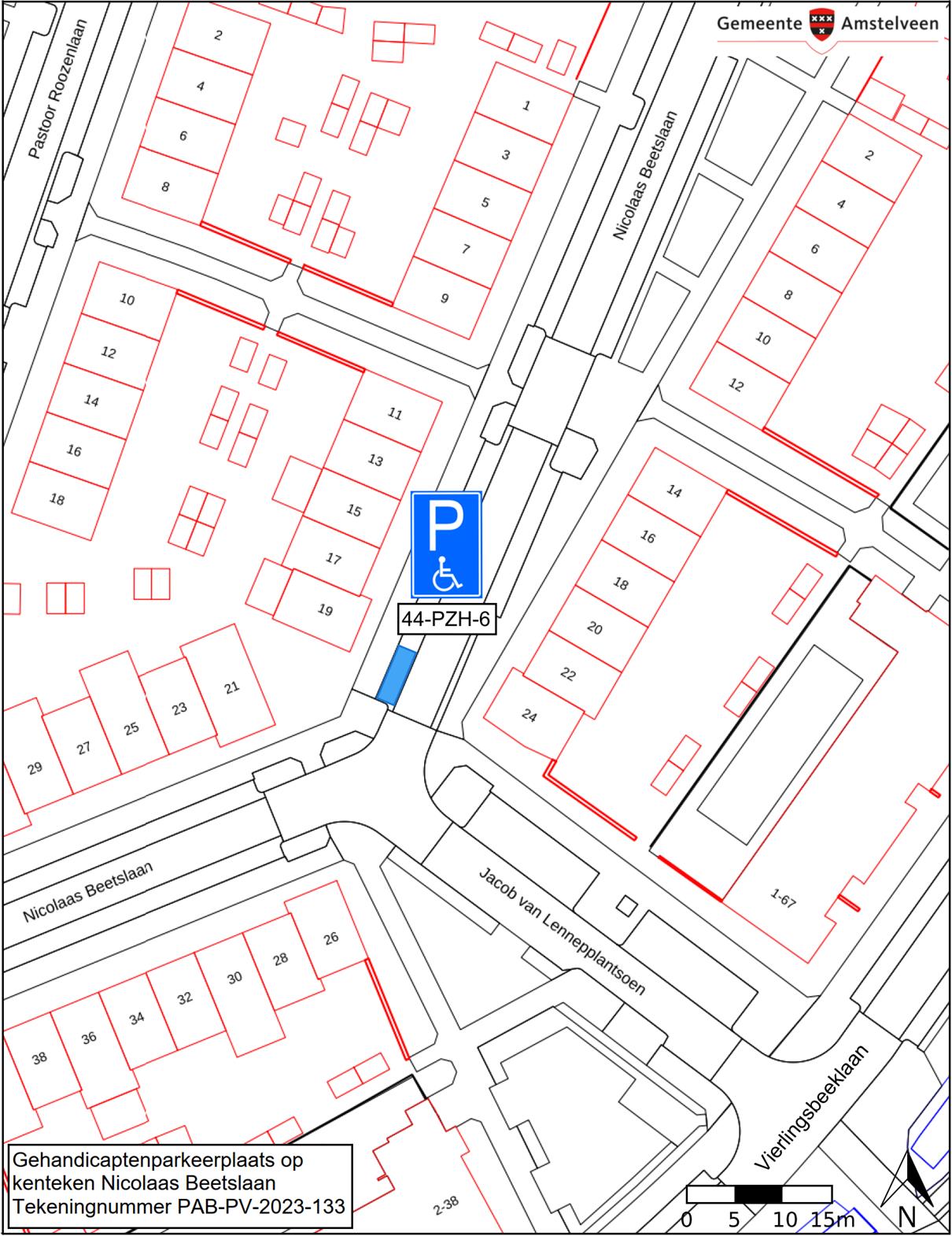 Burgemeester en wethouders van Amstelveen besluiten het parkeren te verbieden op een parkeerplaats in de Nicolaas Beetslaan, zoals aangegeven op tekening PAB-PV-2023-133, met uitzondering van het voertuig met het kenteken 44-PZH-6 (gehandicaptenparkeerplaats).