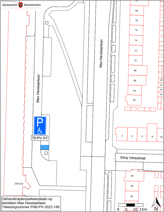 Burgemeester en wethouders van Amstelveen besluiten het parkeren te verbieden op een parkeerplaats aan de Maxhavelaarlaan, zoals aangegeven op tekening PAB-PV-2022-148, met uitzondering van het voertuig met het kenteken 78-PV-XT (gehandicaptenparkeerplaats).
