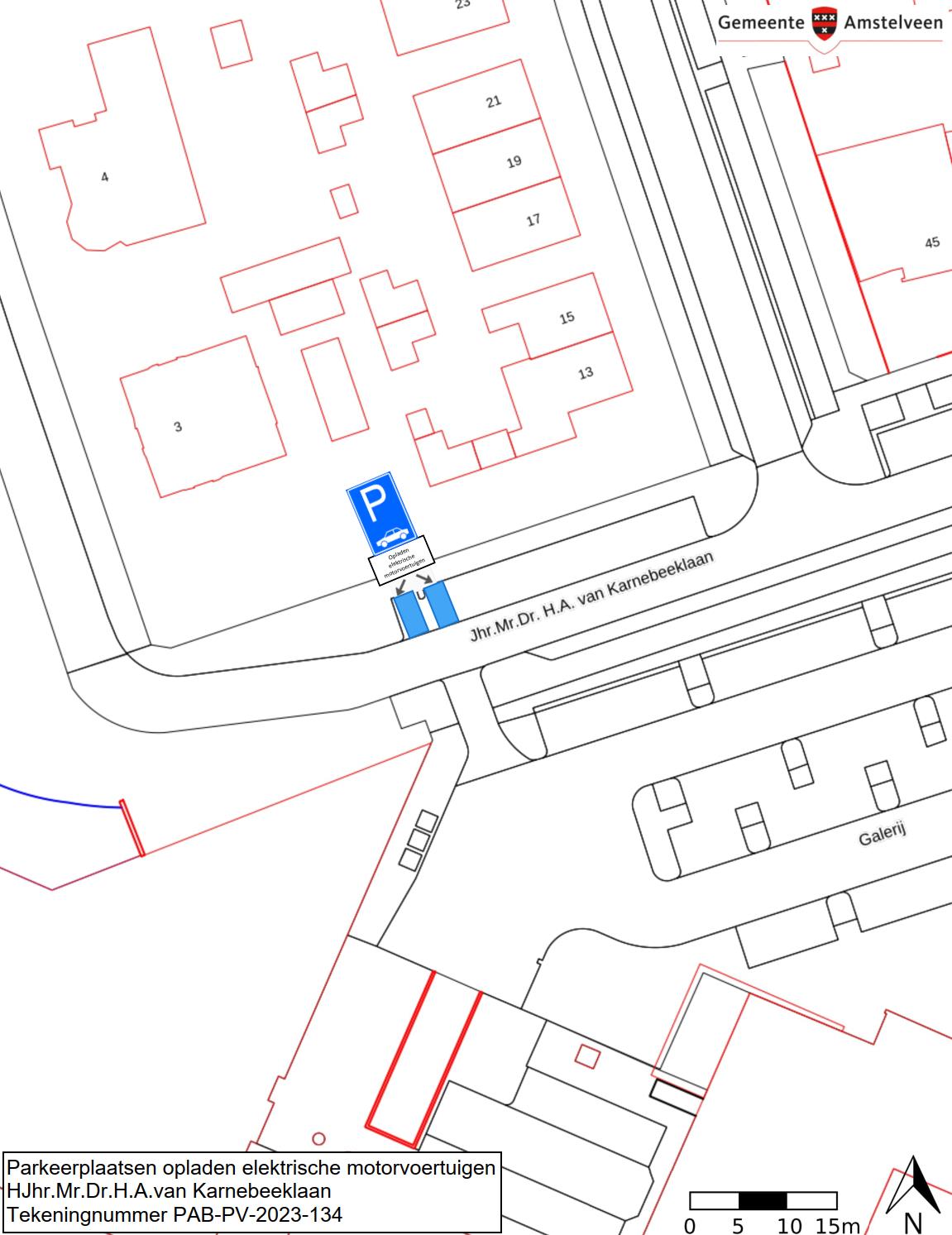 Burgemeester en wethouders van Amstelveen besluiten om aan Jhr.Mr.Dr.H.A. van Karnebeeklaan twee parkeerplaatsen aan te wijzen als parkeerplaats voor het opladen van elektrische motorvoertuigen. De parkeerplaatsen mogen alleen gebruikt worden voor het opladen van deze elektrische motorvoertuigen.
