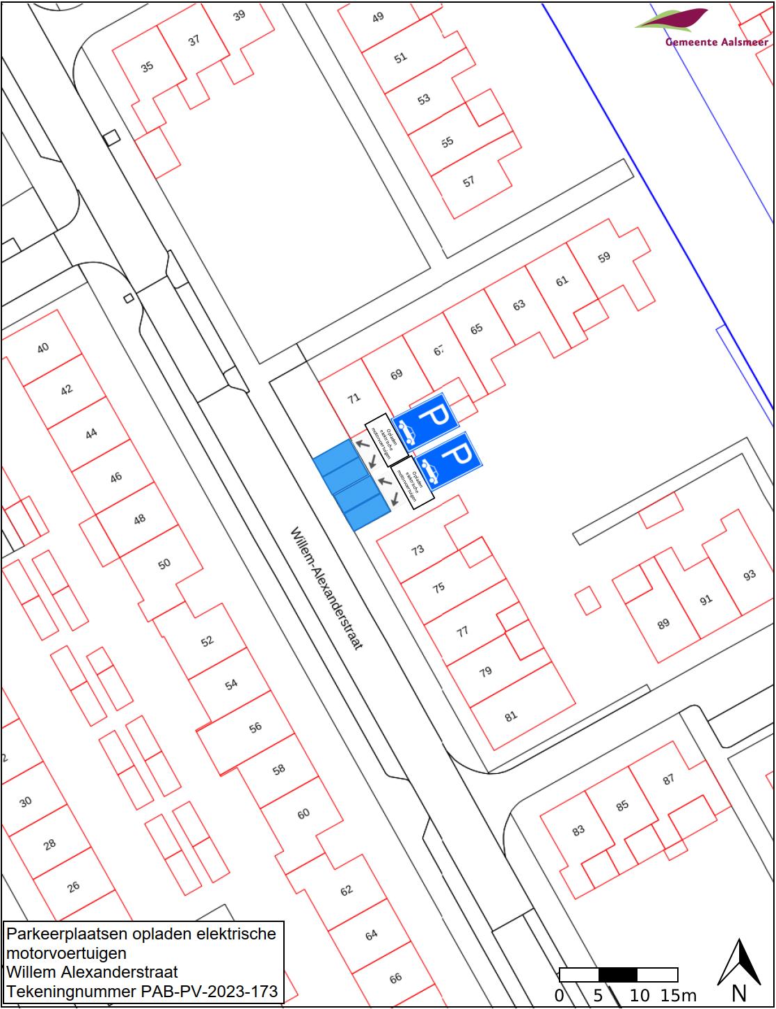 Burgemeester en wethouders van Aalsmeer besluiten om in de Willem Alexanderstraat vier parkeerplaatsen aan te wijzen als parkeerplaats voor het opladen van elektrische motorvoertuigen. De parkeerplaatsen mogen alleen gebruikt worden voor het opladen van deze elektrische motorvoertuigen.