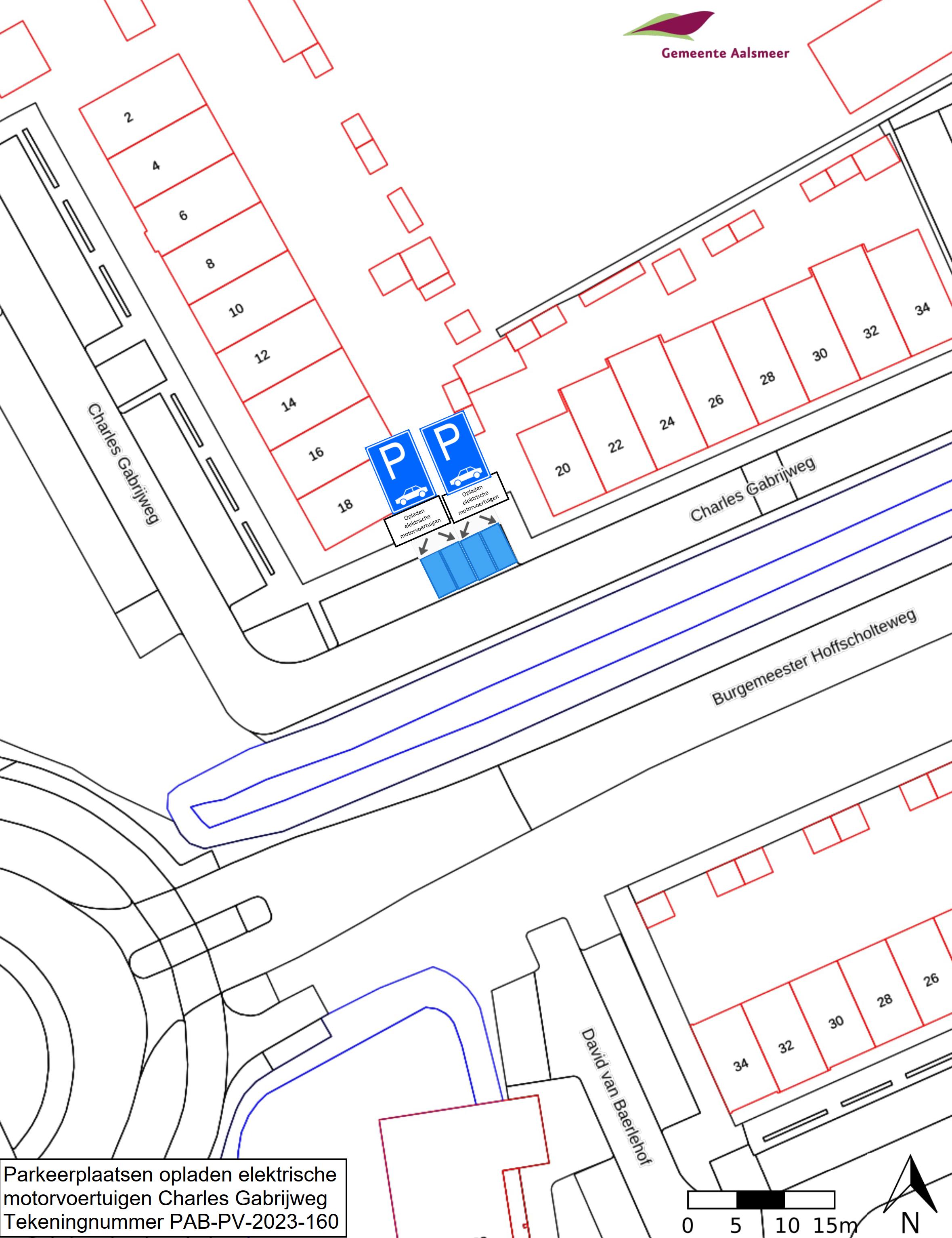 Burgemeester en wethouders van Aalsmeer besluiten om in de Charles Gabrijweg vier parkeerplaatsen aan te wijzen als parkeerplaats voor het opladen van elektrische motorvoertuigen. De parkeerplaatsen mogen alleen gebruikt worden voor het opladen van deze elektrische motorvoertuigen.