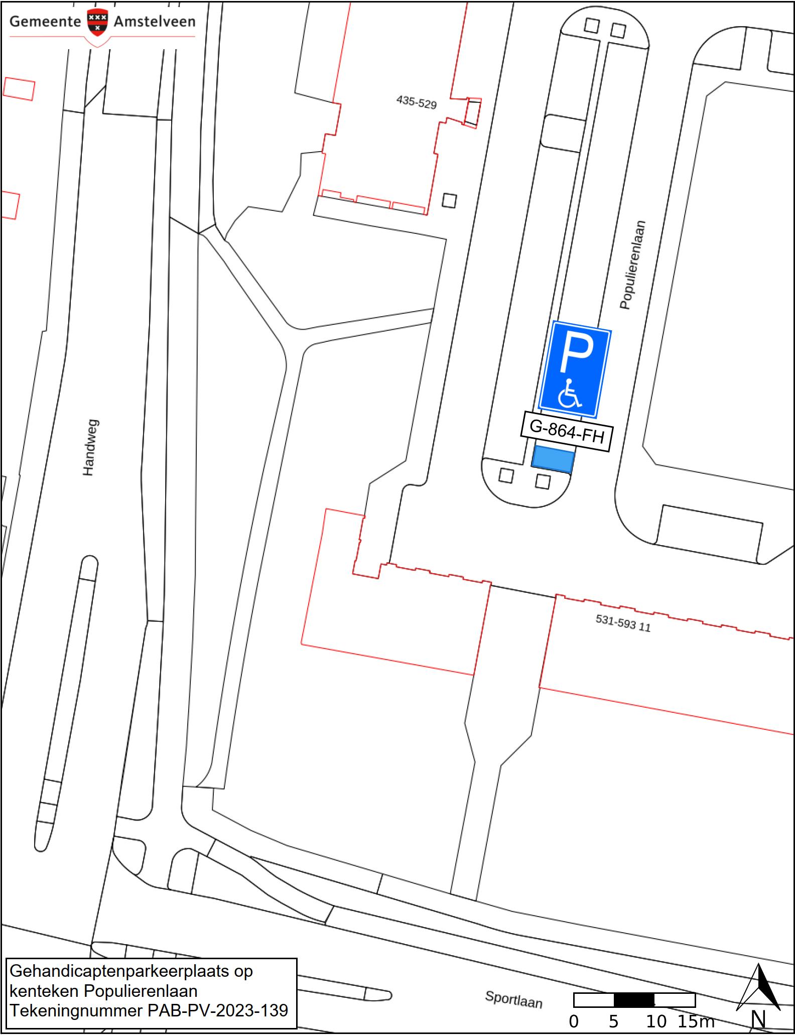Burgemeester en wethouders van Amstelveen besluiten het parkeren te verbieden op een parkeerplaats in de Populierenlaan, zoals aangegeven op tekening PAB-PV-2023-139, met uitzondering van het voertuig met het kenteken G-864-FH (gehandicaptenparkeerplaats).