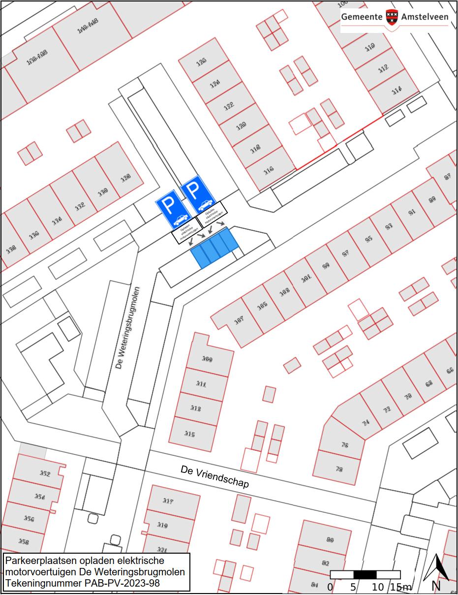 Burgemeester en wethouders van Amstelveen besluiten om aan de Weteringsbrugmolen twee parkeerplaatsen aan te wijzen als parkeerplaats voor het opladen van elektrische motorvoertuigen. De parkeerplaatsen mogen alleen gebruikt worden voor het opladen van deze elektrische motorvoertuigen.