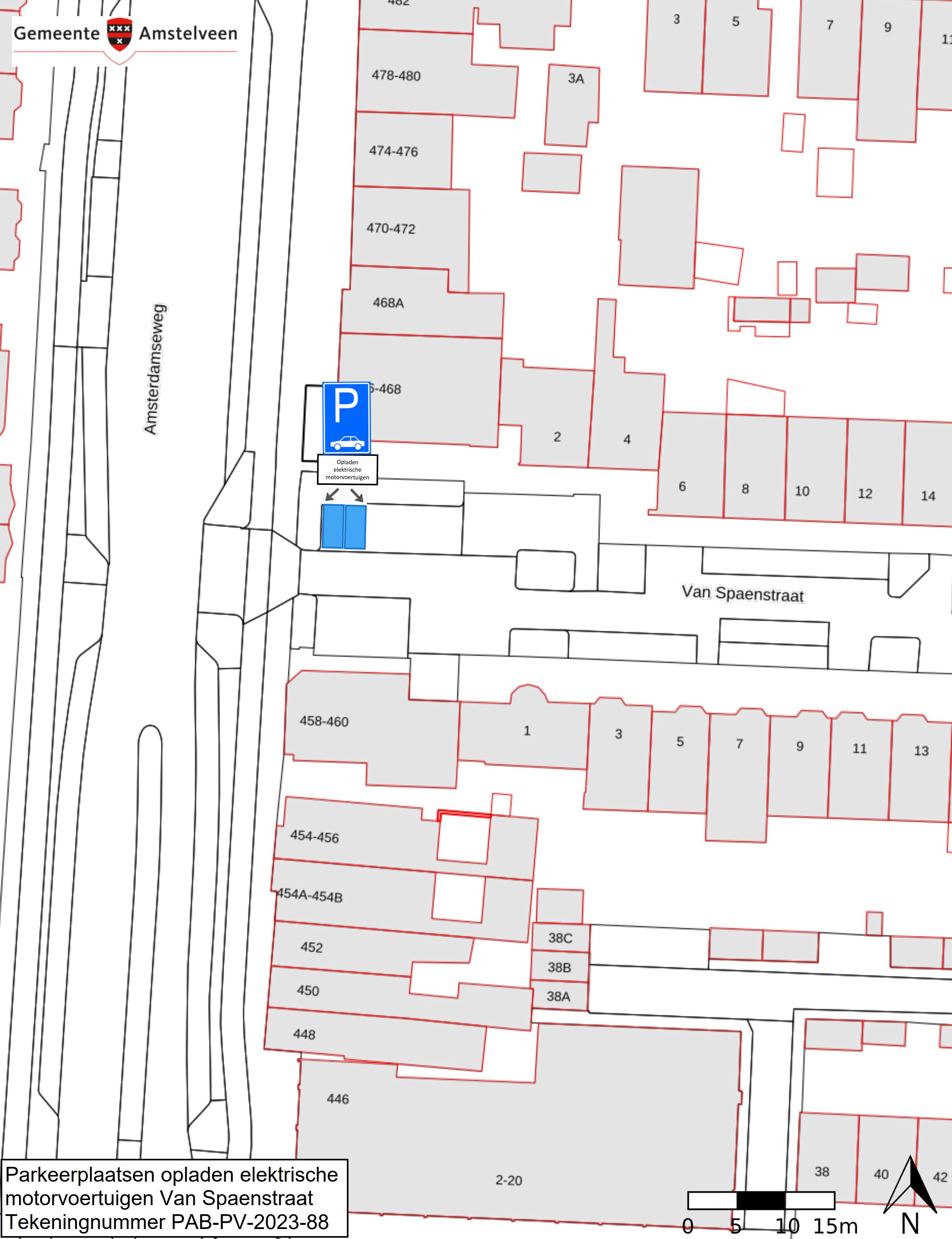 Burgemeester en wethouders van Amstelveen besluiten om in de Van Spaenstraat twee parkeerplaatsen aan te wijzen als parkeerplaats voor het opladen van elektrische motorvoertuigen. De parkeerplaatsen mogen alleen gebruikt worden voor het opladen van deze elektrische motorvoertuigen.