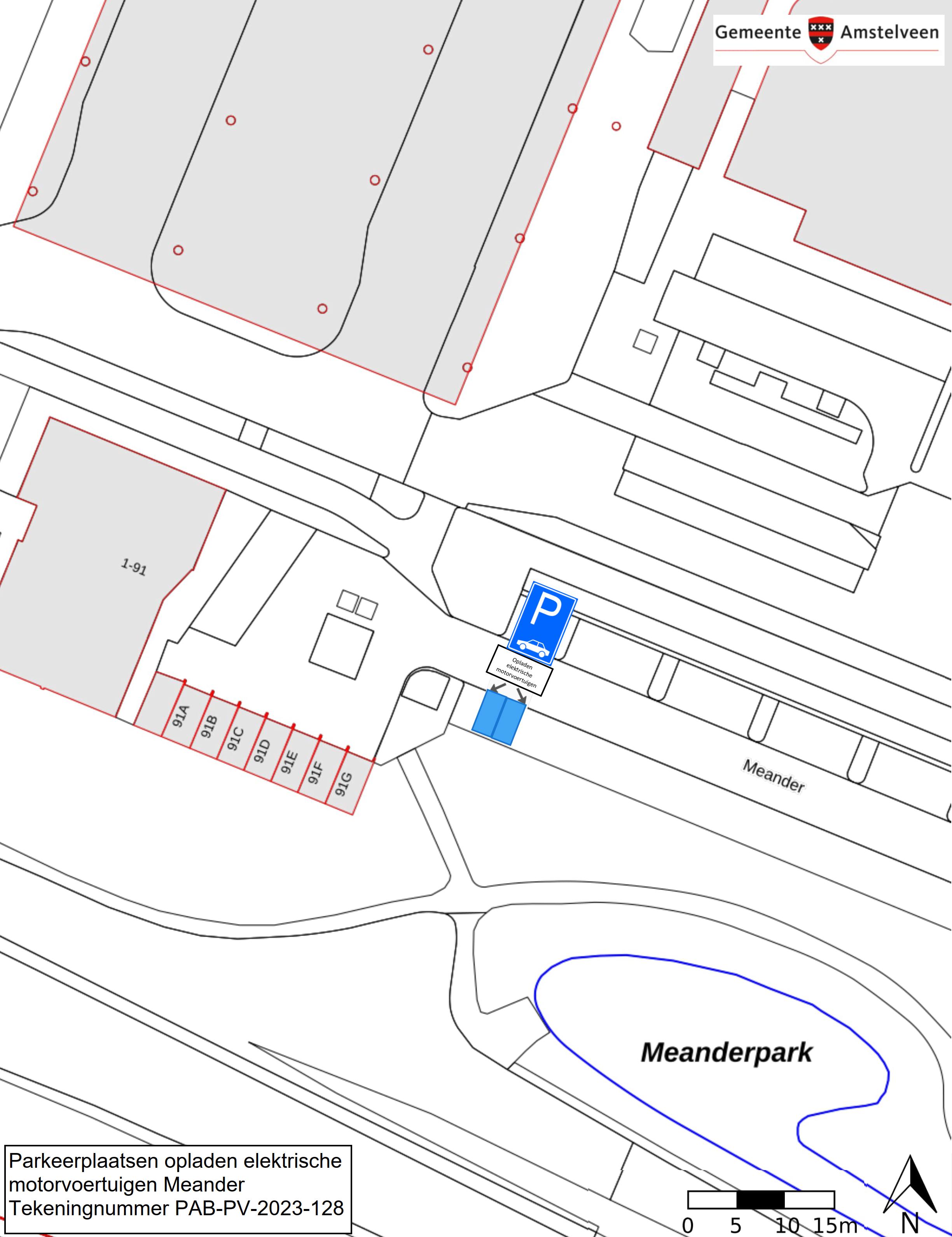 Burgemeester en wethouders van Amstelveen besluiten om in de straat Meander twee parkeerplaatsen aan te wijzen als parkeerplaats voor het opladen van elektrische motorvoertuigen. De parkeerplaatsen mogen alleen gebruikt worden voor het opladen van deze elektrische motorvoertuigen.